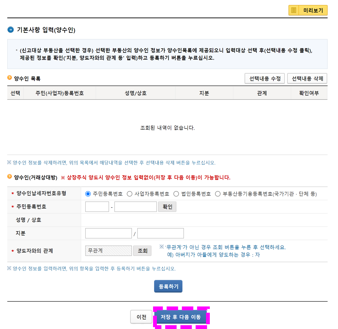 3. 양수인 없으므로 다음 페이지로 넘어가기