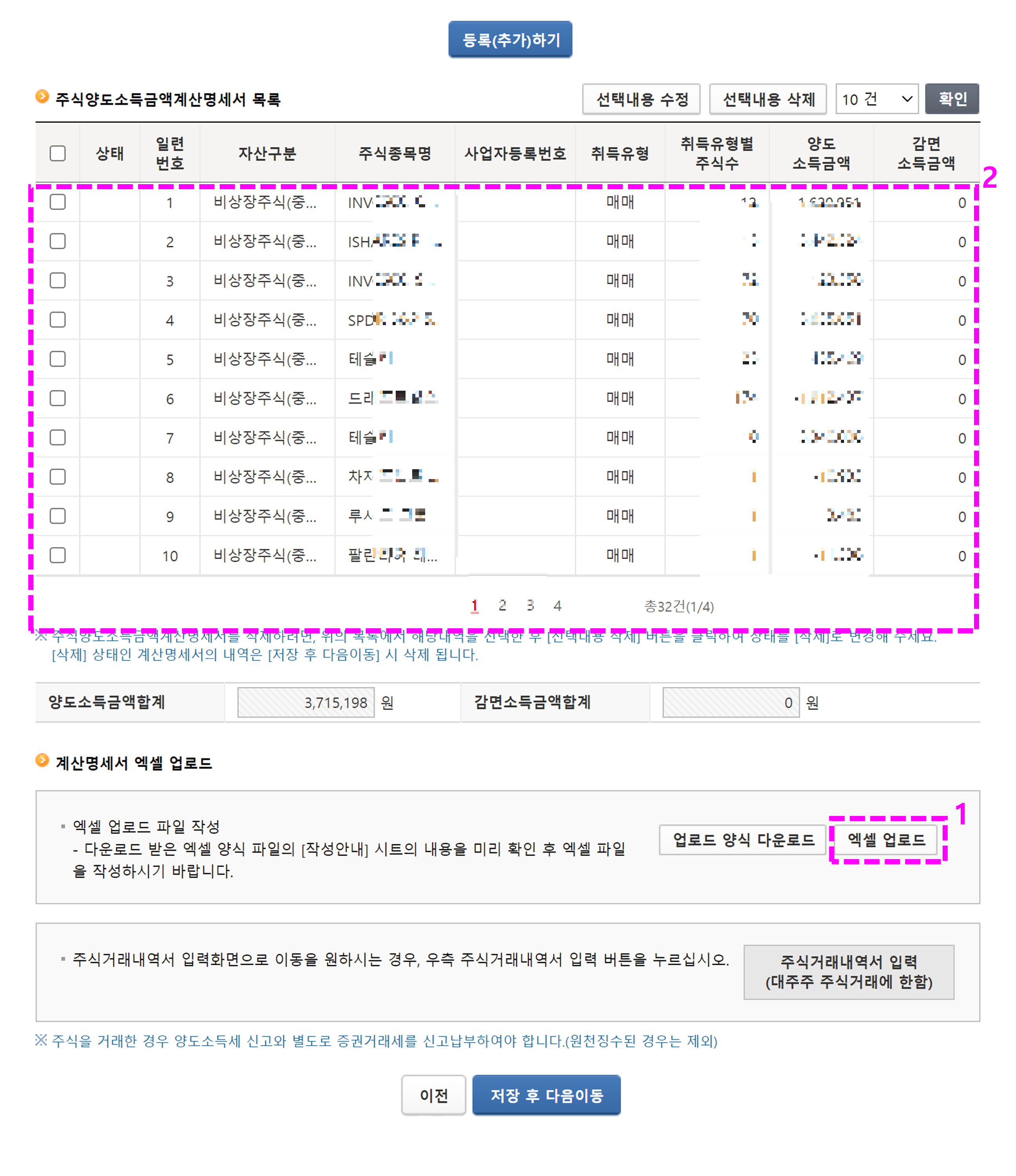 4. [주식등양도소득금액명세서] 페이지에서 맨 하단으로 스크롤 후 [업로드 양식 다운로드] 클릭