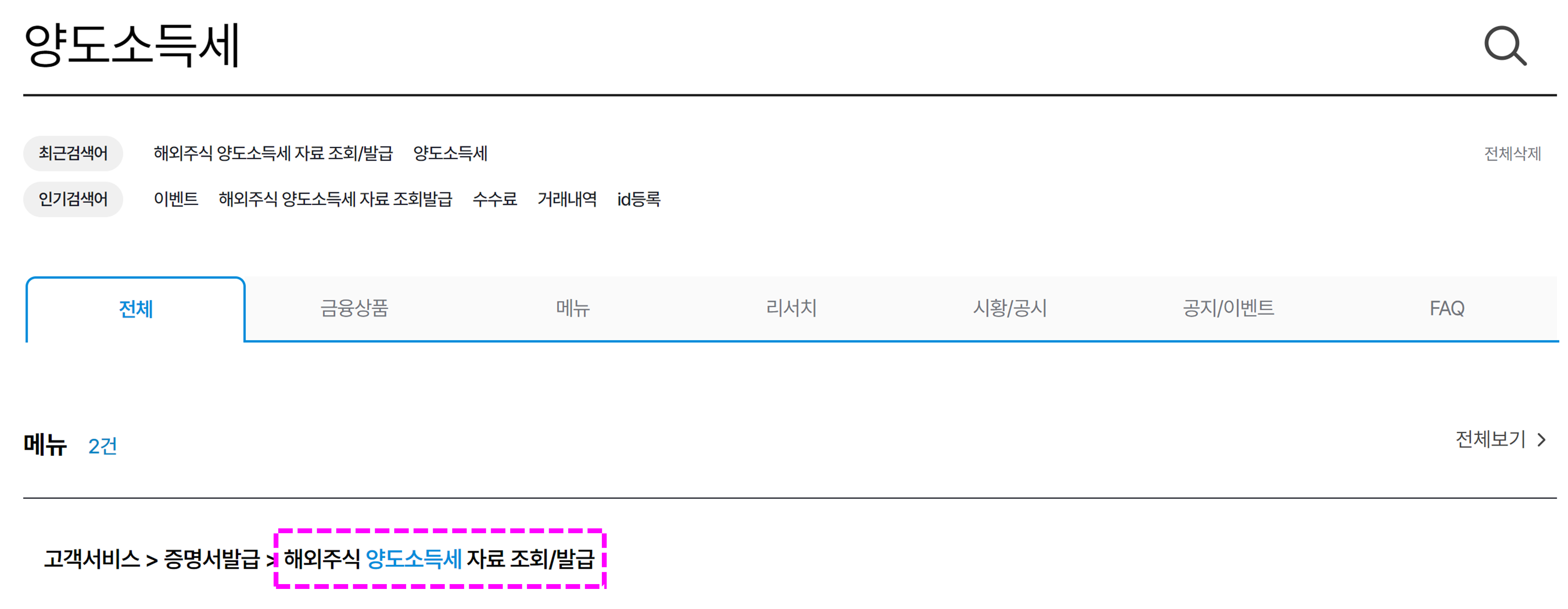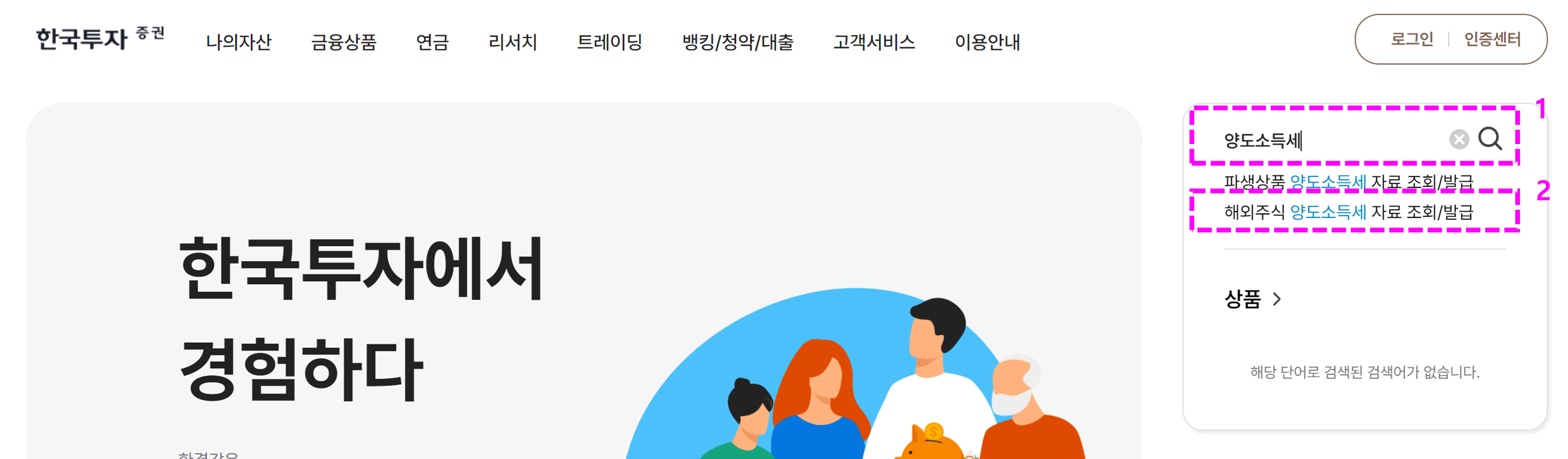 한국투자증권 홈페이지 우측에 검색창이 있어요.