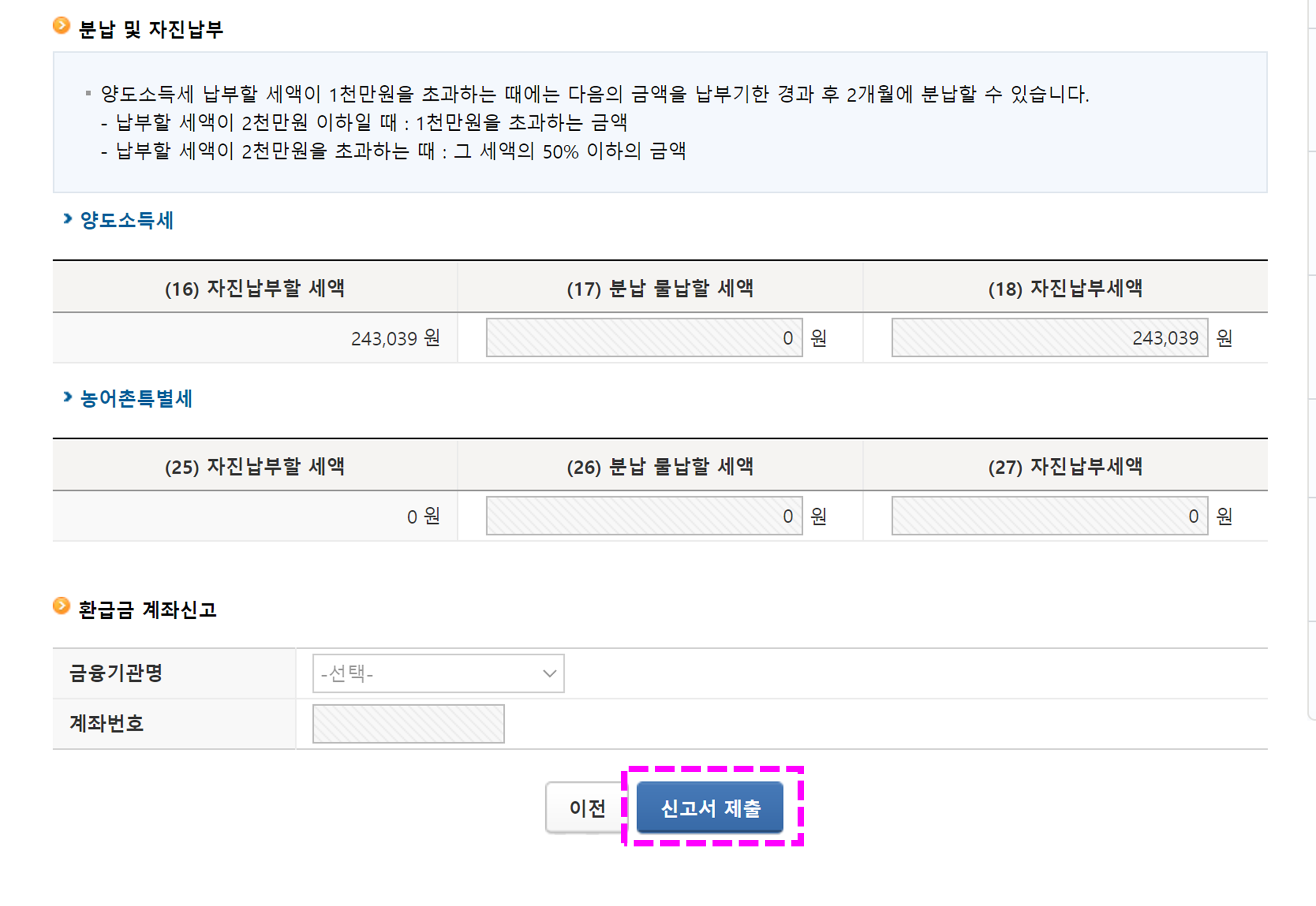 8. 세액결정 완료. 숫자 확인 후 [신고서 제출] 클릭