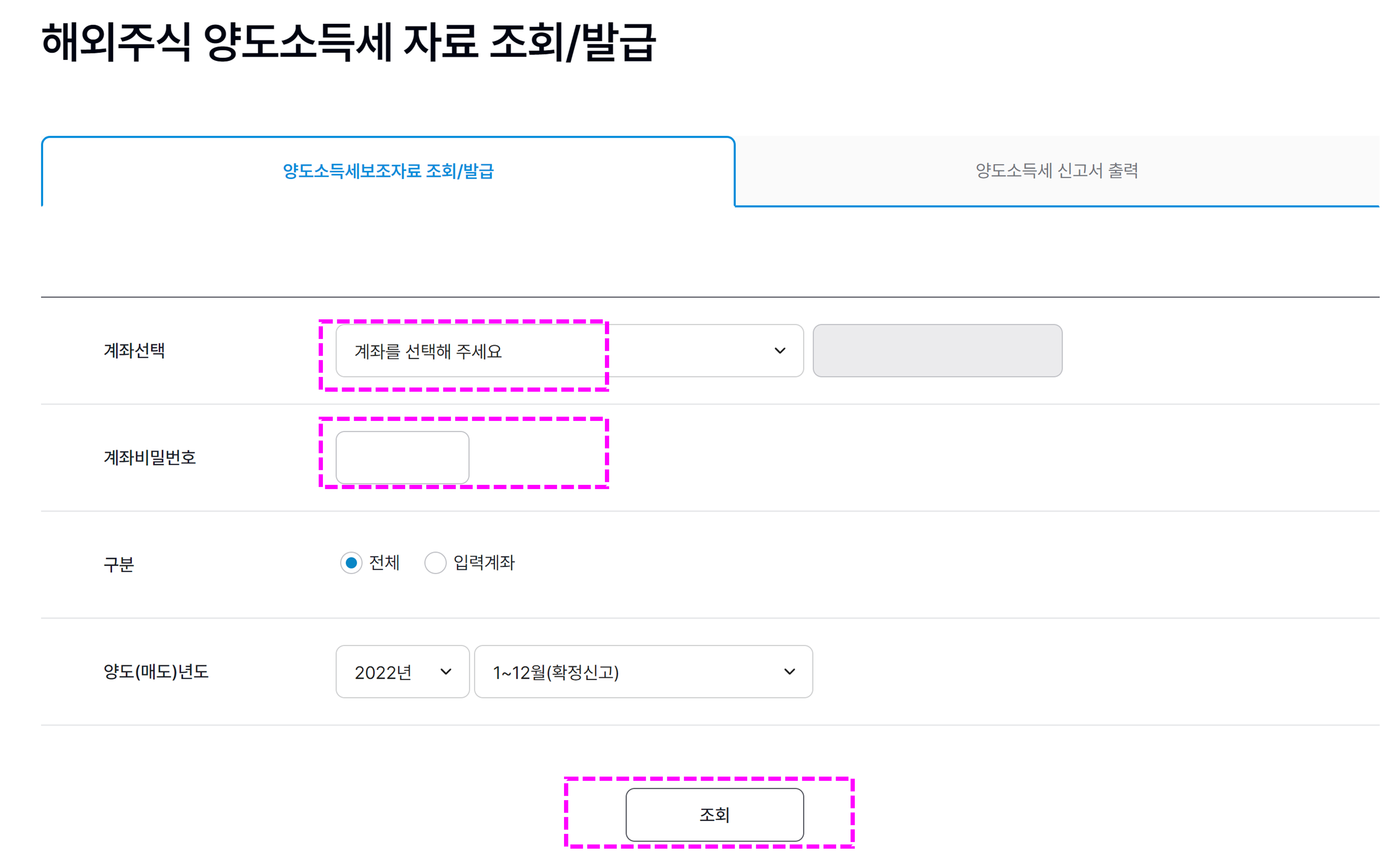 [해외주식 양도소득세 자료 조회/발급] 을 선택합니다.