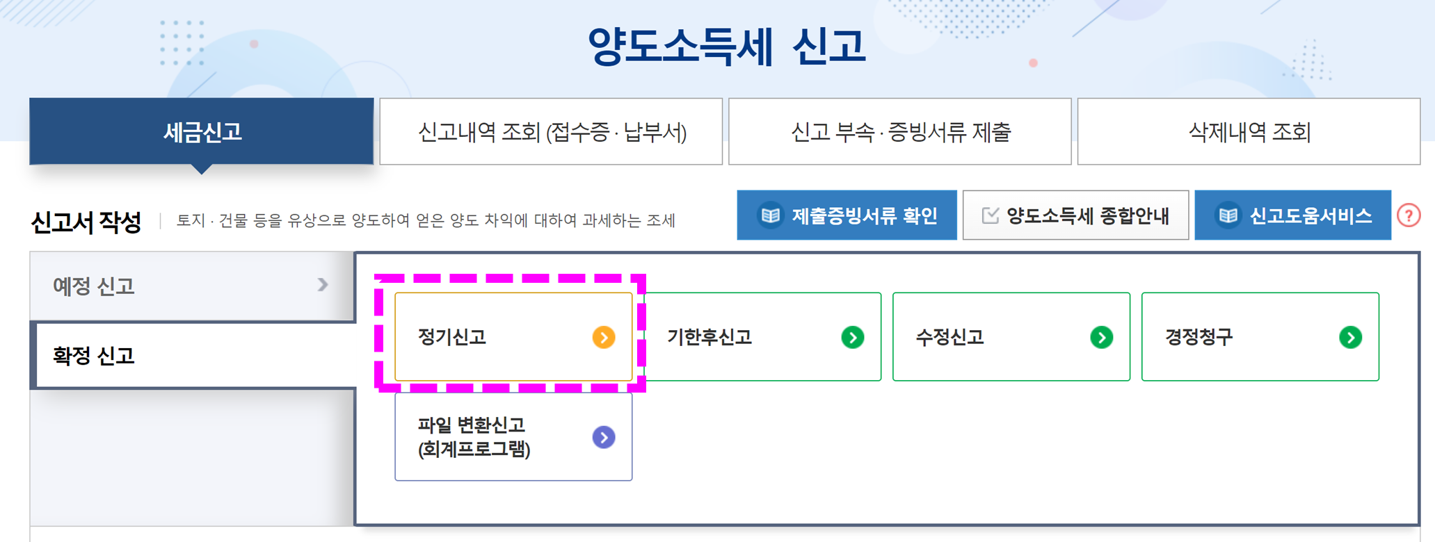 1. 아래 링크 홈택스에 들어간 후 [양도소득세] 탭에서 [확정신고] > [정기신고] 클릭
