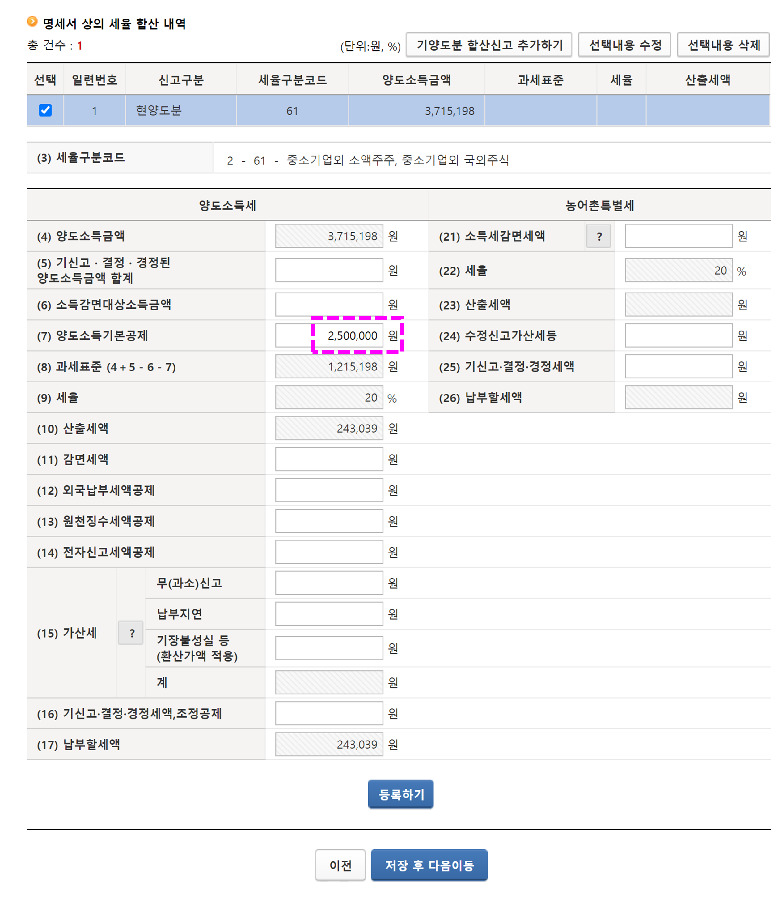 7. [양도소득기본공제] 칸에 2,500,000원 기입한 후 [등록하기] 버튼 클릭