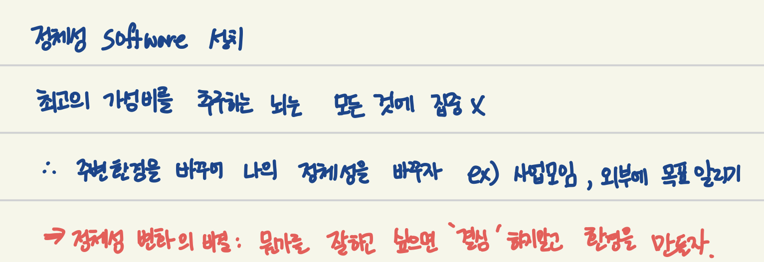 그것은 바로, 우리의 뇌는 ‘현재’에 집중하도록 설계 되어있기 때문이다. 본능적인 행동 즉 걷고, 숨쉬고, 먹는거에 최적화 되어 있기 때문에 미래 보다 현재에 집중을 한다. 따라서 혼자 목표를 세우고 그 목표까지 달성하기에는 어렵다. 목표를 달성하려면, 나의 주변 환경을 바꿔야 한다.