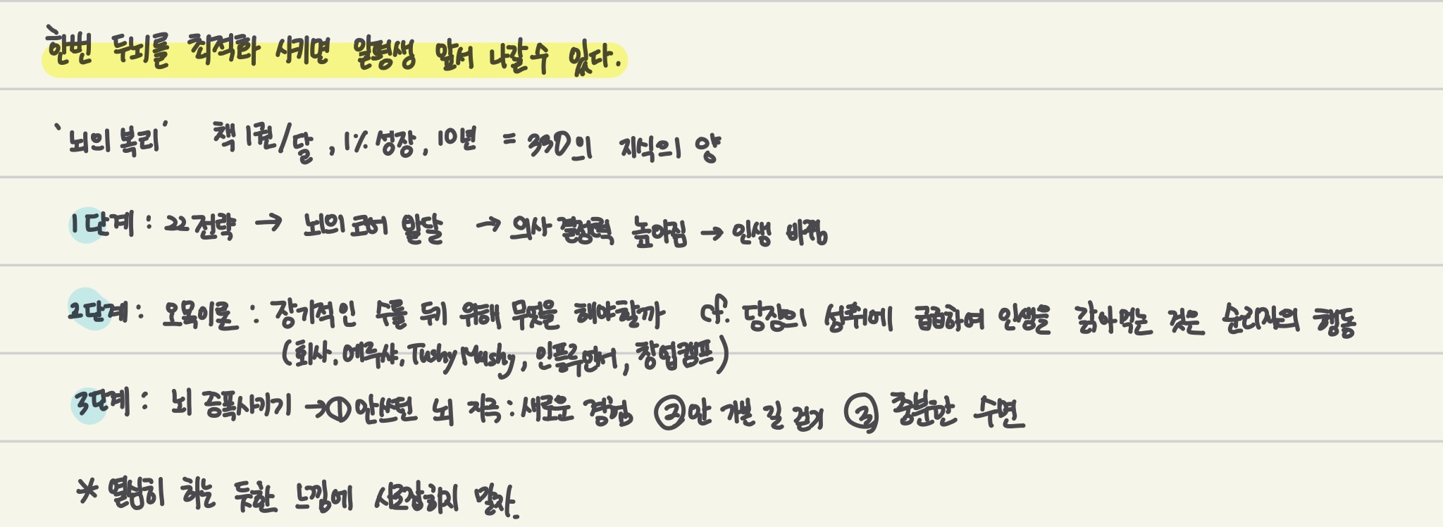 이와 마찬가지로 뇌도 복리를 적용할 수 있다. 자청은 뇌의 복리 효과를 통해 현재의 위치 까지 올라오게 되었다. 뇌에 들어간 지식들이 존비처럼 다른 지식을 얻게 해준다. 따라서 내 뇌에도 하루에 1%씩 성장하게끔 하면 나도 금방 성공한 삶(경제적 자유, 행복)을 누릴 수 있다고 자부한다.